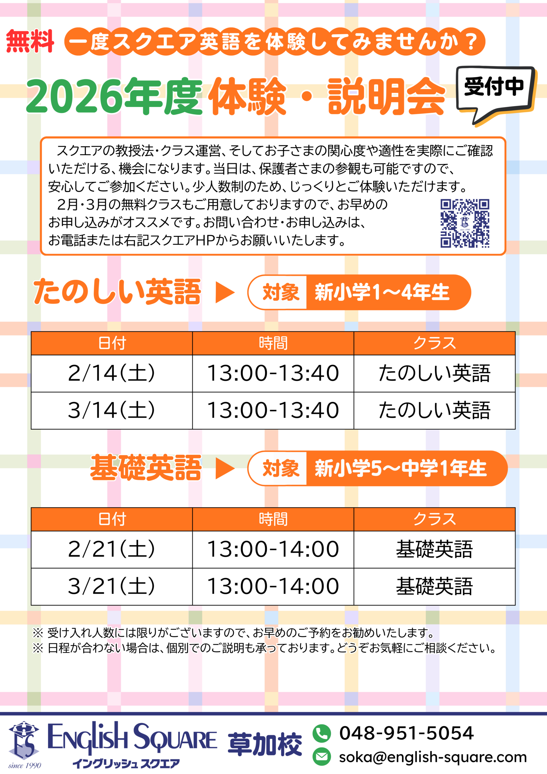 【新年度生受付開始!】新小1生~新中1生対象/無料体験・説明会への参加はこちらから